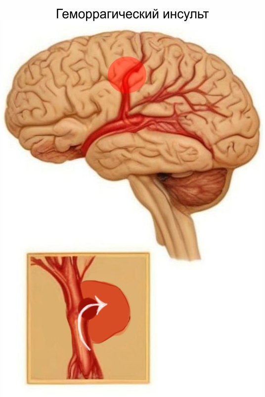 Вторая разновидность инсульта – геморрагический – встречается значительно реже. Он происходит, когда в головном мозге разрывается кровеносный сосуд. Чаще всего это происходит на пике повышения артериального давления при гипертоническом кризе.