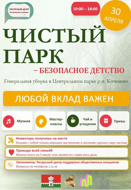 30 апреля с 10:00 до 18:00 часов Ресурсный центр Коченёвского района приглашает вас принять участие в генеральной уборке нашего Центрального парка – провести время с пользой для общего места отдыха.