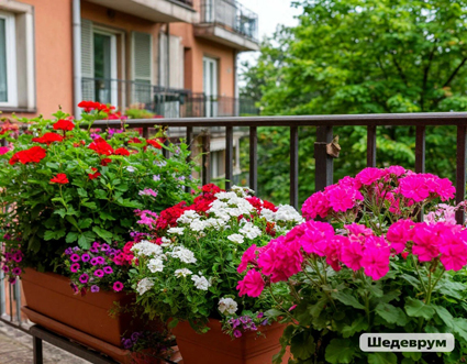 Для создания по-настоящему яркой и пышной композиции высаживайте растения в горшки разных размеров – это добавит пространству объём и декоративность. Такое цветочное оформление превратит балкон в настоящее украшение фасада и будет радовать не только вас, но и всех прохожих. Если же балкона нет, многие цветы прекрасно растут в специальных подвесных кашпо, закреплённых снаружи на подоконнике.