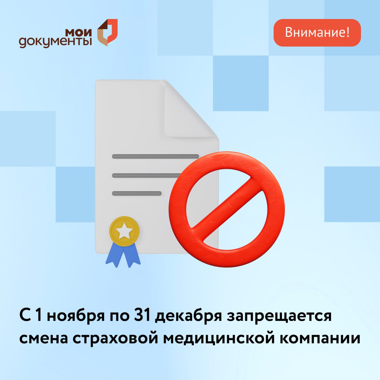 📢 Обращаем ваше внимание на то, что с 1 ноября и по 31 декабря 2025 года запрещается смена страховой медицинской компании внутри региона страхования (ФЗ № 326 ст. 16 пункт 1, подпункт 3).