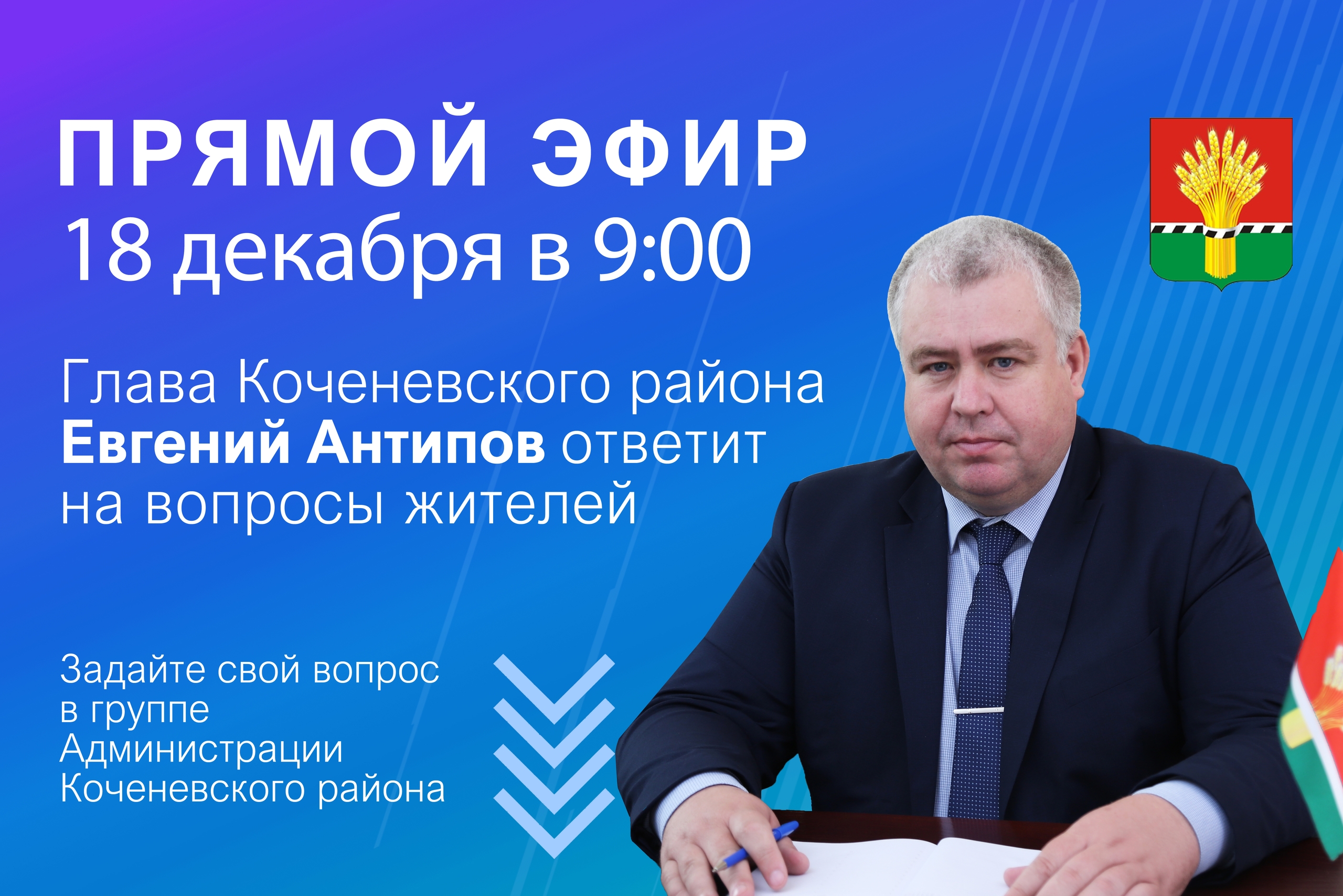18 декабря в 9:00 Глава Коченёвского района Евгений Антипов ответит на вопросы жителей в прямом эфире.