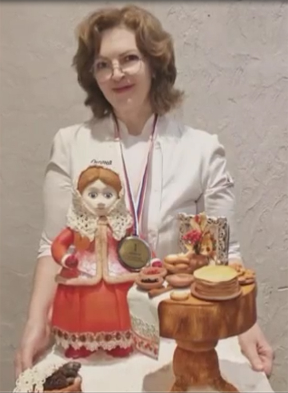 Кулинарное изделие под названием «Масленица» создала кондитер Оксана Цвелович. Косынку и другие мелкие детали она буквально связала крючком из съедобных нитей.