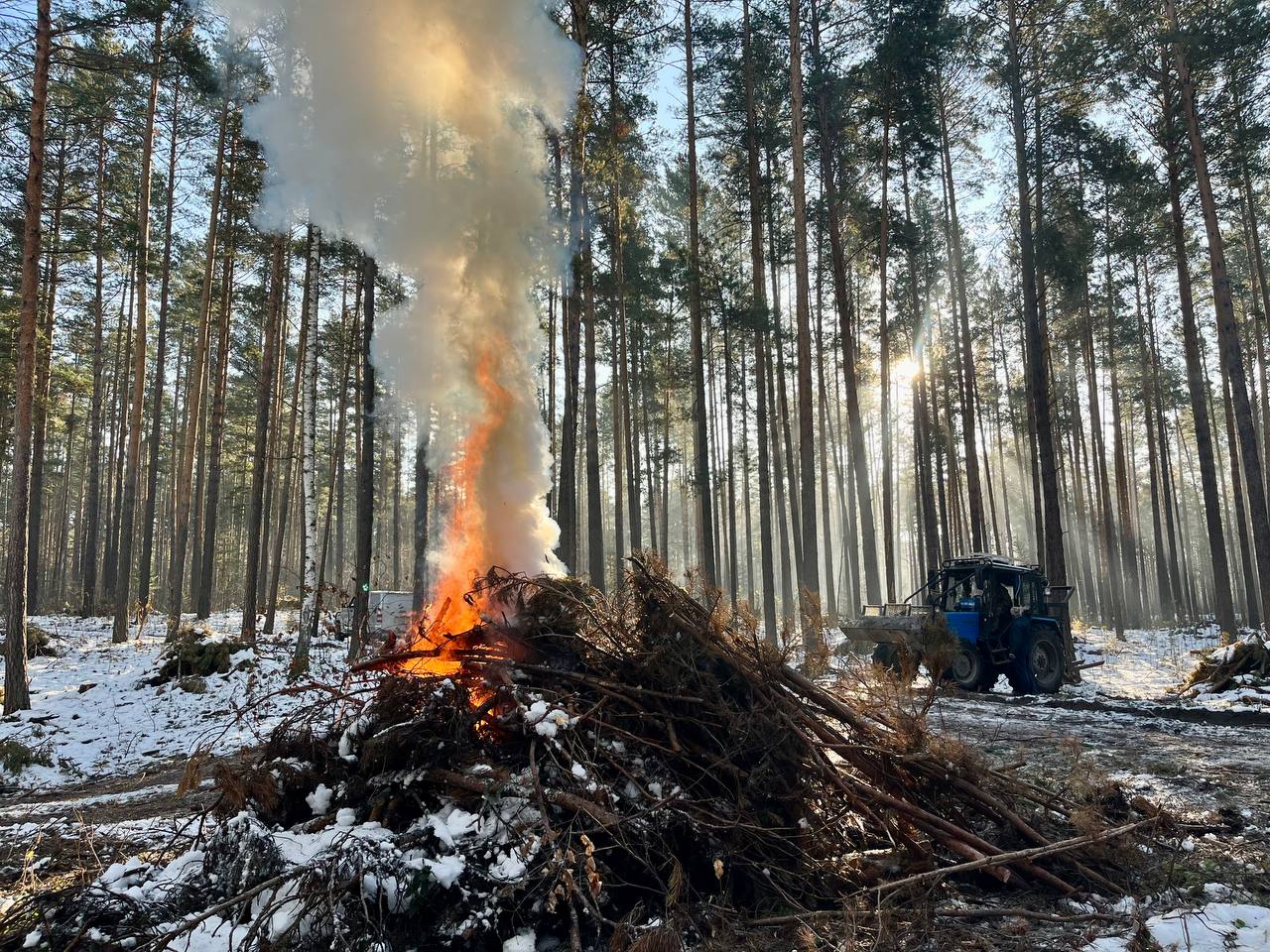 С окончанием пожароопасного сезона в лесных массивах Новосибирской области стартовал период активной работы по приведению территорий в порядок. Лесопользователи приступили к обязательному сжиганию порубочных остатков – сучьев, вершин и древесины, оставшихся после заготовки. 24 октября в ходе пресс-тура продемонстрирован процесс сжигания порубочных остатков на территории, подконтрольной Новосибирскому лесничеству.