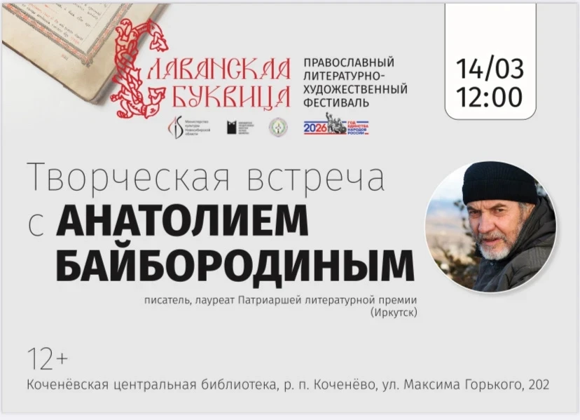 14 марта в 12:00 часов в Коченёвской центральной библиотеке (р.п. Коченёво, ул. Максима Горького, 202) пройдёт творческая встреча с Анатолием Байбородиным.