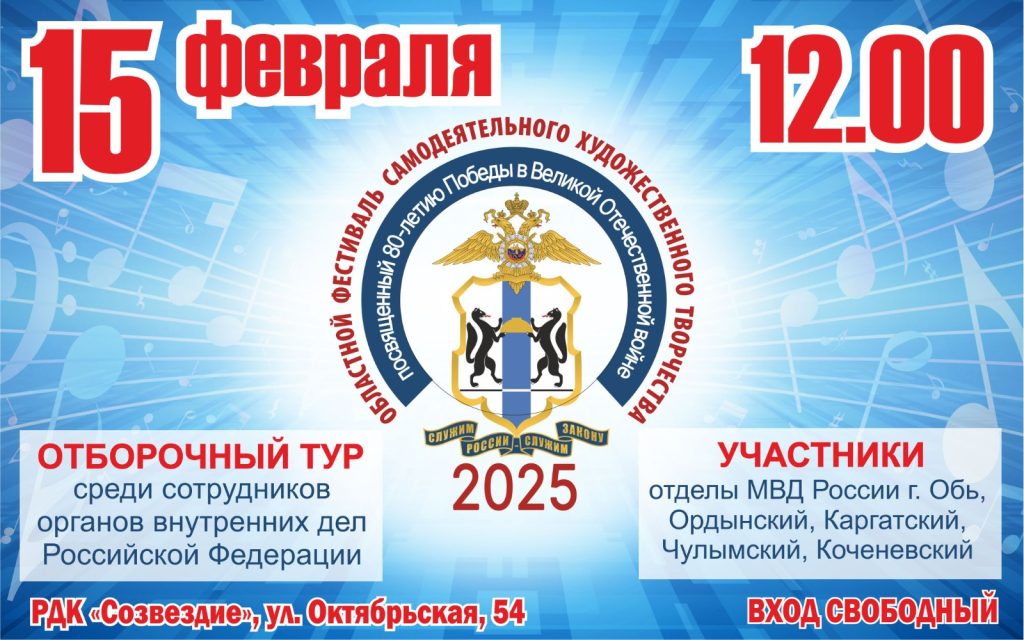 АктуальноВ Коченёво пройдёт отборочный тур среди сотрудников органов внутренних дел РФ областного Фестиваля самодеятельного художественного творчества «Служу России. Служу Закону» Published On: 13.02.2025